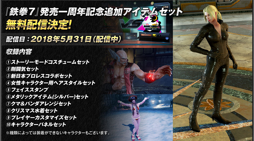 発売一周年記念追加アイテムセット無料配信決定! 1.ストーリーモードコスチュームセット 2.剛闘気セット 3.新日本プロレスコラボセット 4.女性キャラクター用ヘアスタイルセット 5.フェイススタンプ 6.メタリックアイテム(シルバー)セット 7.クマ&パンダアレンジセット 8.クリスマス水着セット 9.プレイヤーカスタマイズセット 10.キャラクターパネルセット